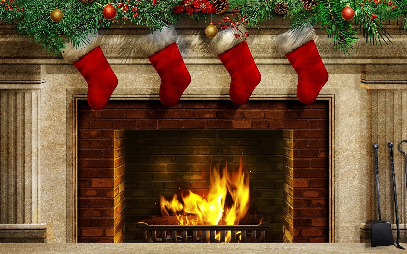 Obješene Božićne čarape poviše upaljene vatre u kaminu - download besplatna pozadina za desktop